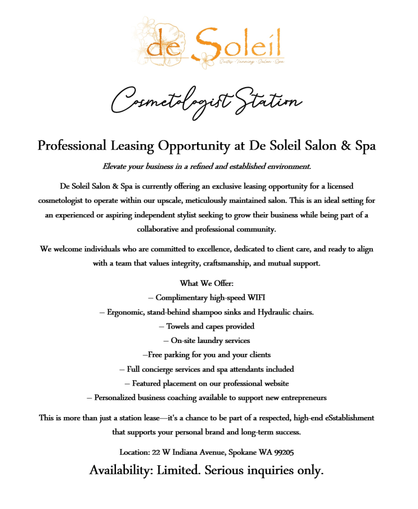 At De Soleil Salon and Spa, we’re proud to be a hybrid salon—offering the best of both worlds for beauty professionals. Our unique structure welcomes both independent business owners and commission-based employees, creating a dynamic and supportive environment where all artists can thrive.